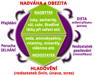 Není tedy divu, že se Vám v takovém případě hubnout nedaří. Zpočátku nějaké to kilo samozřejmě shodíte, než dojde k přeladění systému Vašeho těla, ale zhubnete hlavně na svalech, protože má tělo nedostatek a zároveň i nevyváženost živin, která už je dána samotným nedostatkem zmíněné energie. A takto vzniká pro mnohé začarovaný kruh (viz obrázek).